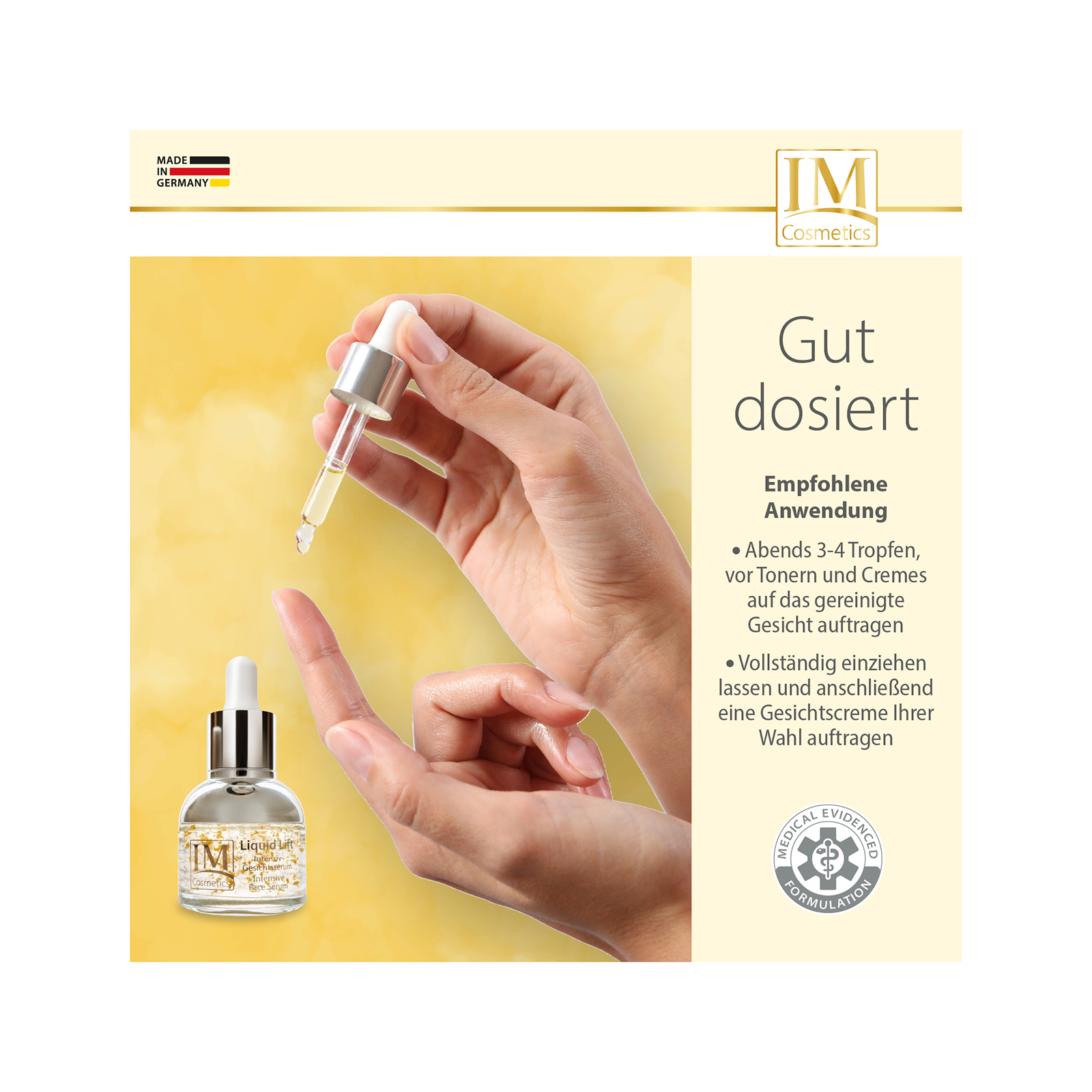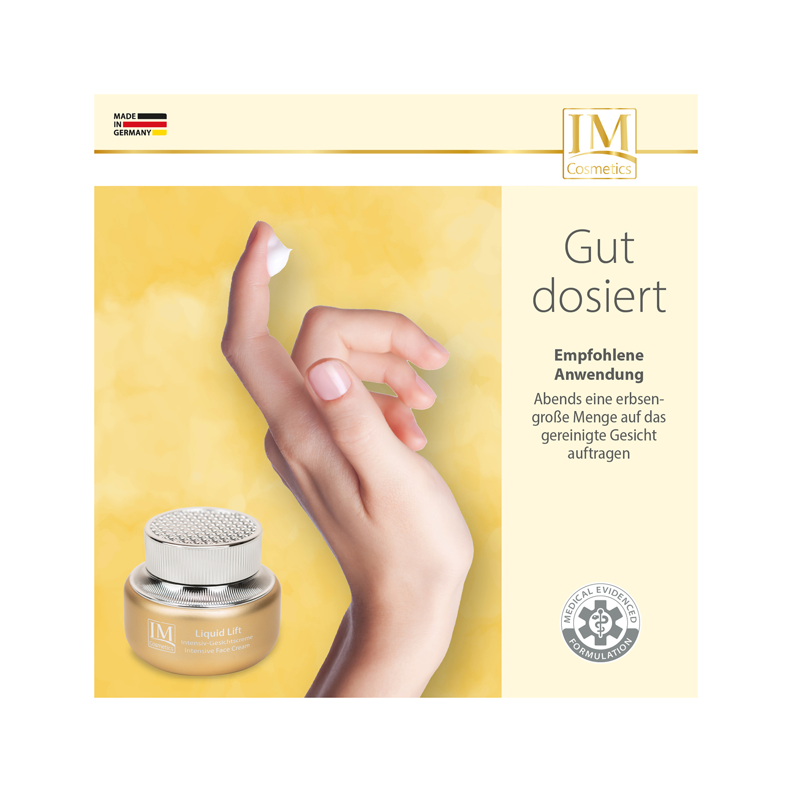 Das IM Cosmetics Liquid Lift Deluxe Set vereint zwei High-Performance-Produkte der neuesten Generation: das Liquid Lift Intensiv-Gesichtsserum und die Liquid Lift Intensiv-Gesichtscreme. Gemeinsam bilden sie ein unschlagbares Team für maximale Hautverjüngung, intensive Regeneration und luxuriöse Pflege auf höchstem Niveau.